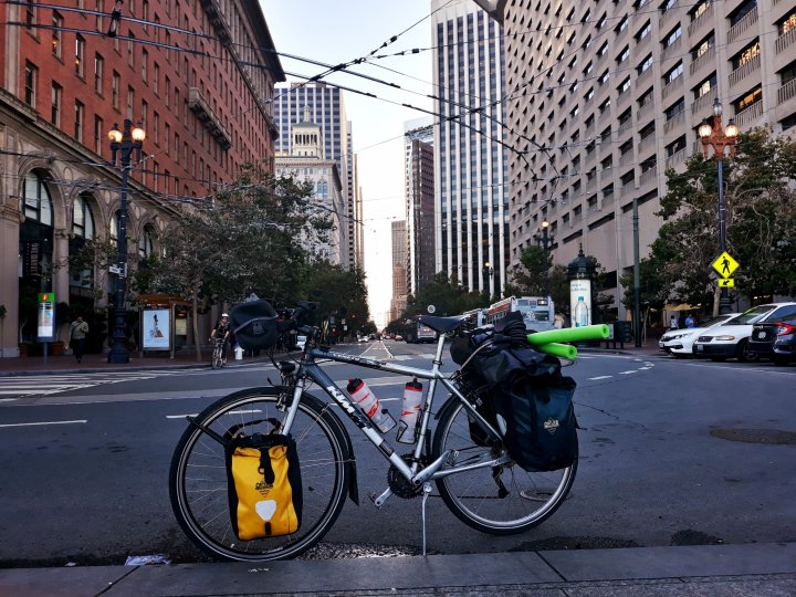 Travelled along Hwy 1 +++ cold fog all the time – combined with a lot of steep climbing; that’s not a good combination if one wants to keep warm and healthy +++ after two days on Hwy 1 I climbed back to Hwy 101 – no cold fog there +++ Redwoods were amazing, total silence if you stop; I camped two times inside of the Redwoods – never slept better +++ it meant a lot of work to do the few hundred miles from Portland to San Francisco – more than I would have thought +++ ran into some other cyclists on the campgrounds – they were fun +++ mature blackberries everywhere along the road – nommnommnommnomm +++ for my day off in SanFran I had the perfect weather and the perfect lazy mood to invest 55$ into the bigbus-tour +++ John and Linda hosted me in Lafayete – John is an old friend of Bob who I met last year in Fort Lauderdale +++ there is almost no time to write things down, sort pictures out or communicate – all I do is pedaling, eating and sleeping +++ I start crossing the United States from west to east now – first destination is Yosemite +++ stay tuned