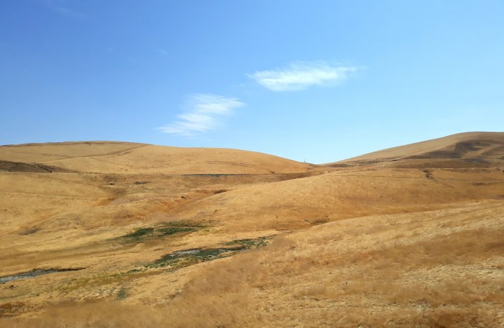 The next day the big climbing above Sierra Nevada began. Very moderate during the morning. Landscape changed from huge monoculture agriculture areas (I saw mostly almonds and peaches) to hilly grassland with a lot of oaks.