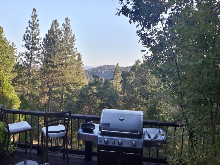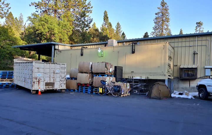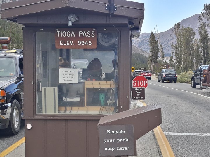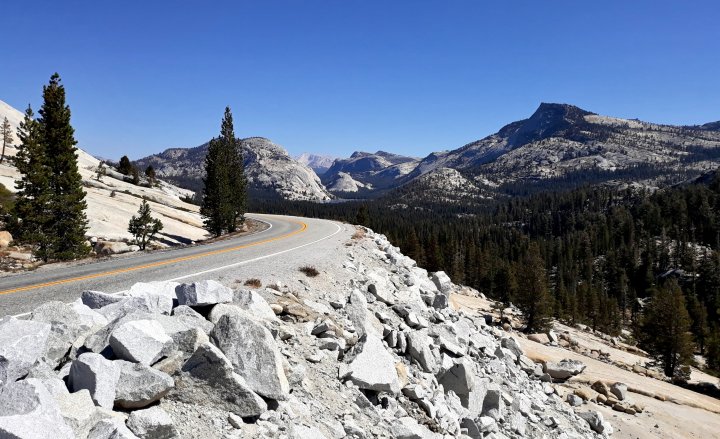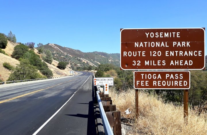 The serious ascent to the Tioga Pass (which is the highest point on the Sierra-crossing highway 120 and the east-entrance of Yosemite National Park) began after noon with a steep non-stop elevation-gain of more than 2,000 feet. Groveland is the last town before the west-entry of the park. It offers no campground and the local warmshower-hosts were not available. I asked at the local grocery-store if someone knew a possible tent-space and the manager gave me immediately the permission to pitch my tent at the parking-lot. Well, that would have been the most public spot for camping so far, but it was fine for me. Then, after everything was set up and shortly after dusk Deborah and Craig came along, processed what’s going on and invited me to stay at their house. Shower, Campfire on the porch, 4 dogs, whitewine – it became a long and nice evening with a lot of talking.