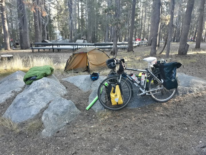 From the next morning I gained 6,000 feet of elevation before I reached ‘White Wolf’-Campground in Yosemite @ 8,000. Just 50 miles in more than 8 hours of travelling-time. It was steep. And there was no view – just trees. And it was labor-day-weekend.
